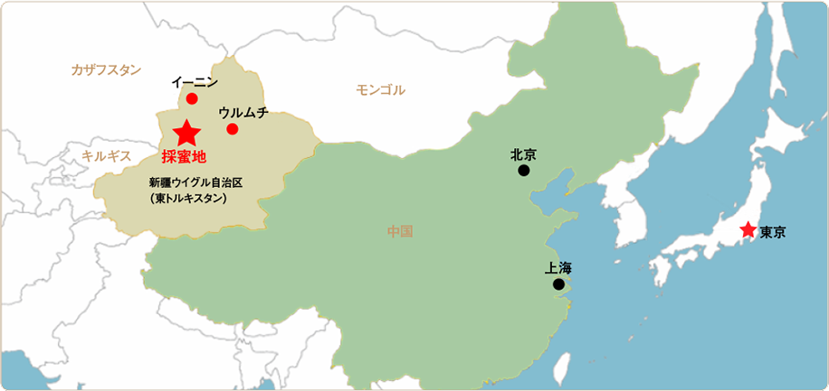 日本からは飛行機で上海か北京を経由し、新疆ウイグル自治区のウルムチまで飛び、ウルムチから小型の飛行機でイーニンへ行きます。更にオフロード車で陸路を10時間。日本からは3日とかかる、まさに秘境の地で採蜜しています。